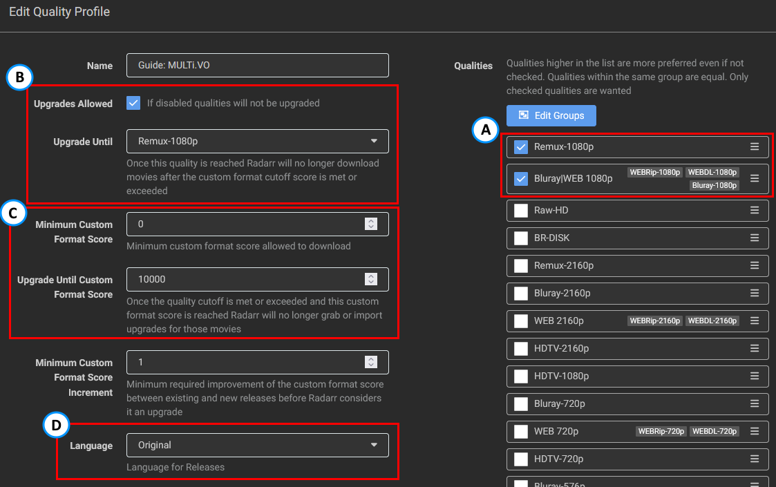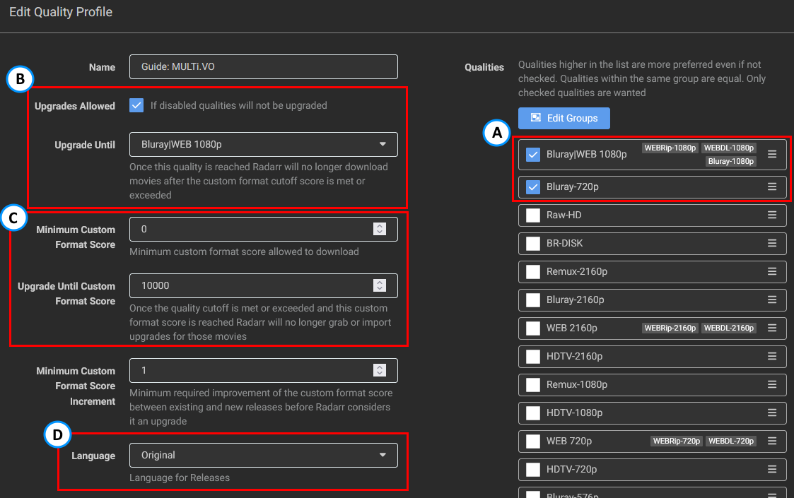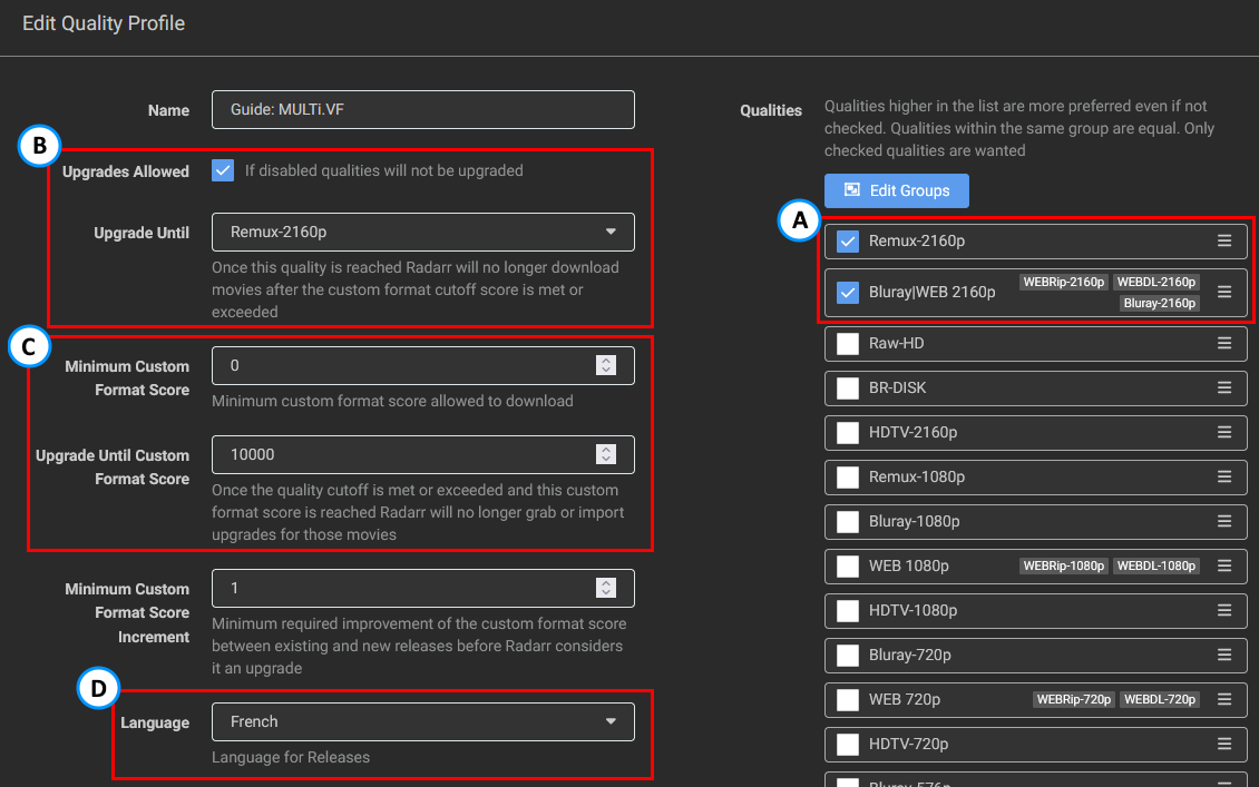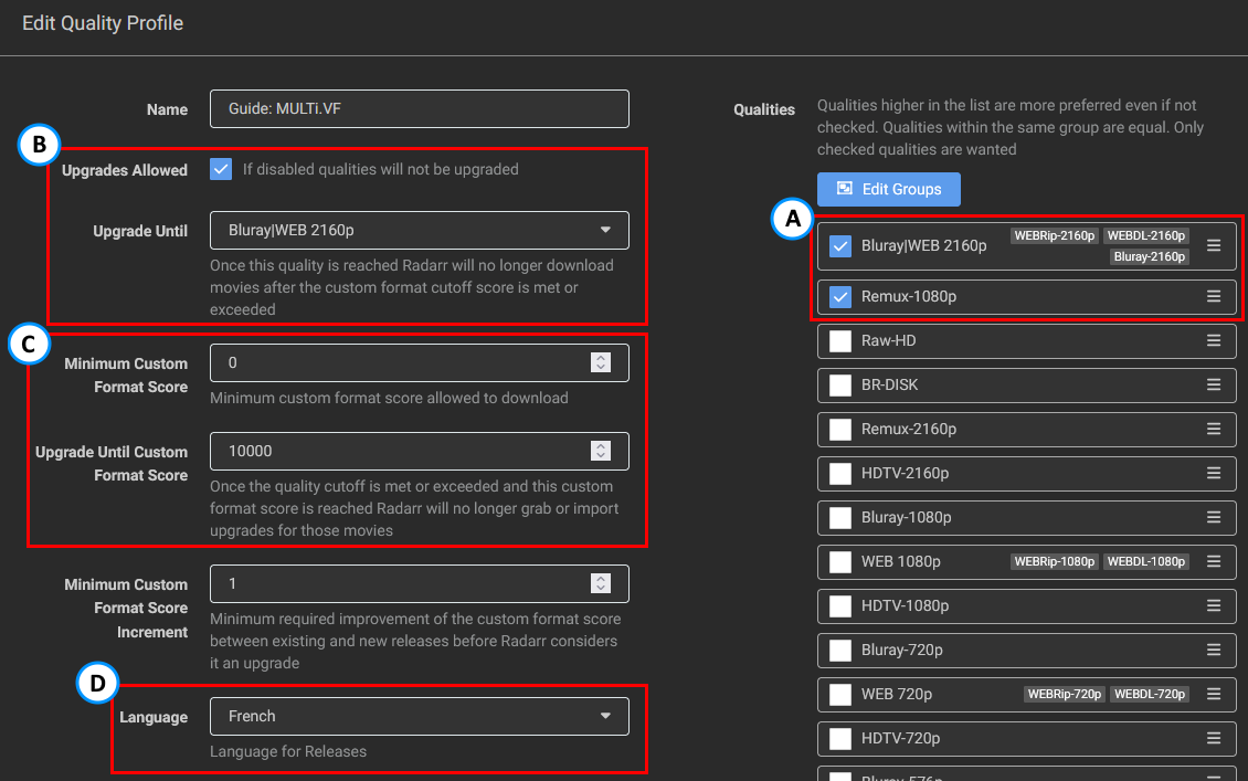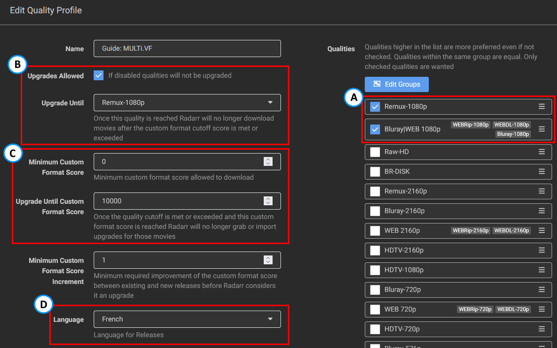 Make sure you merge the Blu-ray and WEB qualities into one group under your Quality Profile's qualities. This is due to the fact that potential releases with French audio may not exist in WEB. The reason why we didn't select the WEB-DL 720p is that you will hardly find any releases that aren't done as 1080p WEB-DL.